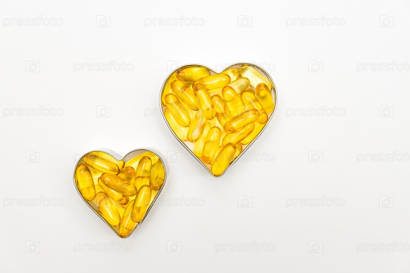 Капсулы рыбьего жира в коробках в форме сердца на белом фоне, добавка витамина D, концепция здравоохранения, вид сверху