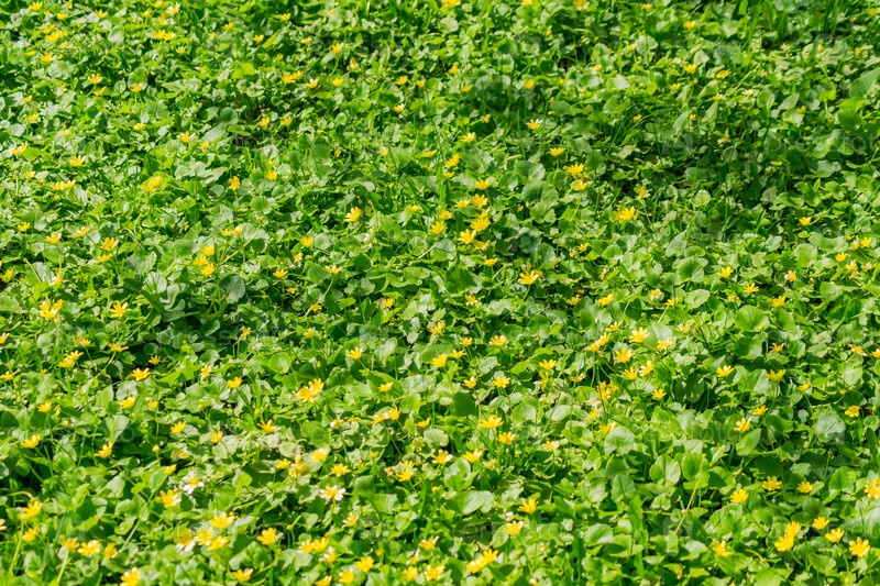 Поле маленьких желтых цветущих цветов в солнечный день. Цветущий луг