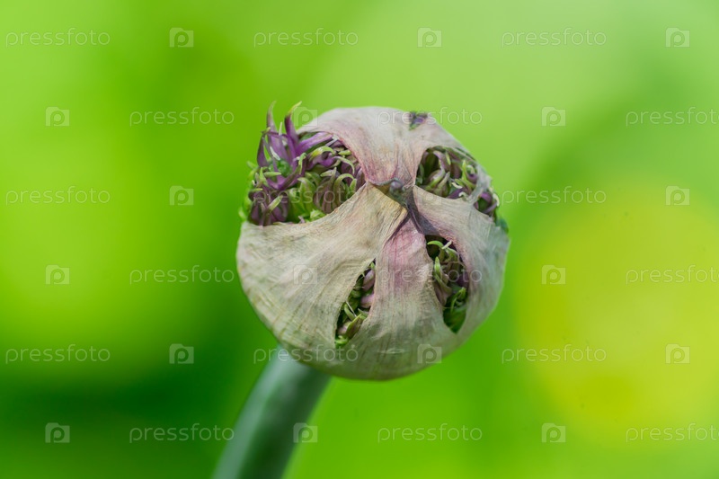 Бутон цветка аллиума или декоративный чеснок на зеленом фоне
