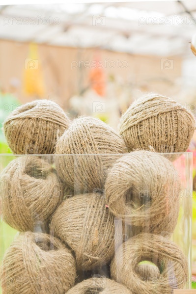 Много мотков в стеклянной вазе из конопли. Производство волокна