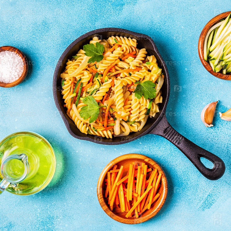 Паста фузилли с кальмарами, цукини и морковью
