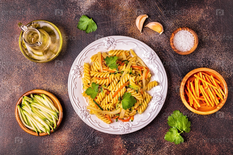 Паста фузилли с кальмарами, цукини и морковью