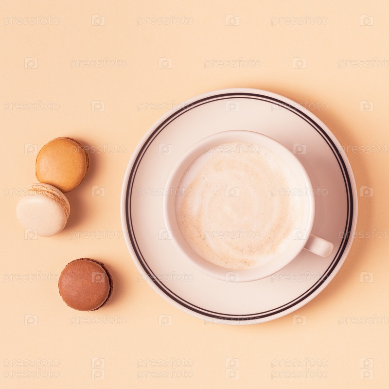 Чашка кофе с миндальным печеньем на пастельном фоне