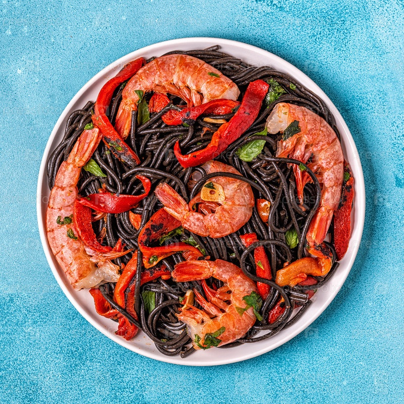 Черные спагетти с креветками и овощами