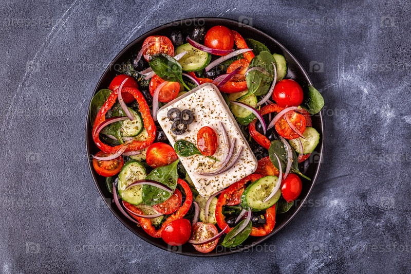 Греческий салат из свежих огурцов, помидоров, сладкого перца, шпината, красного лука, сыра фета и оливок