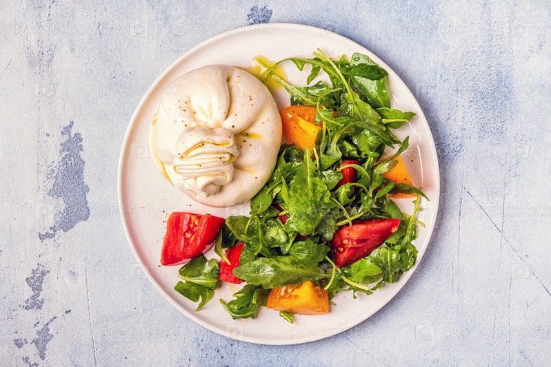 Итальянский сыр Буррата со свежей рукколой, помидорами, оливковым маслом