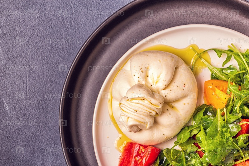 Итальянский сыр Буррата со свежей рукколой, помидорами, оливковым маслом