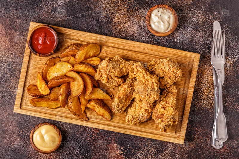 Жареные куриные крылышки с жареными ломтиками картофеля