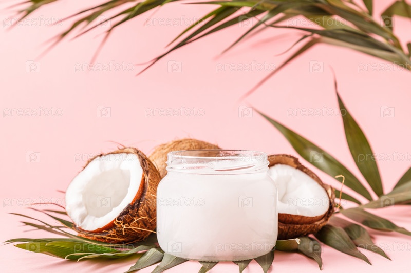 Кокосовое масло и кокосы на ярком пастельном фоне