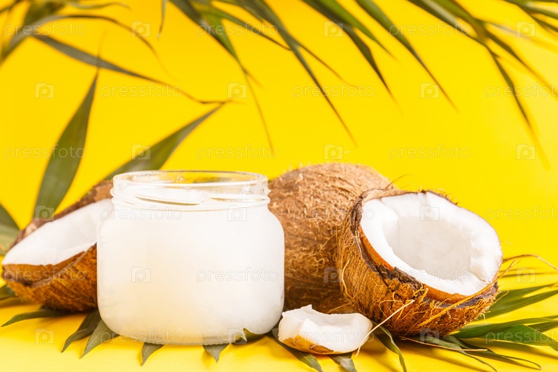 Кокосовое масло и кокосы на ярком пастельном фоне