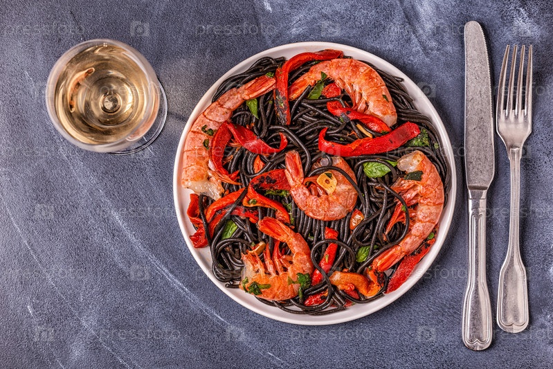 Черные спагетти с креветками и овощами