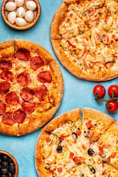 Набор различных пицц - пепперони, вегетарианская, курица с овощами