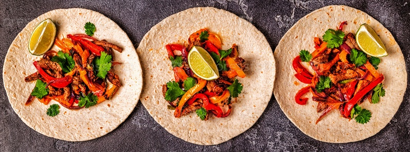 Фахитас с цветным перцем и луком, подается с лепешками