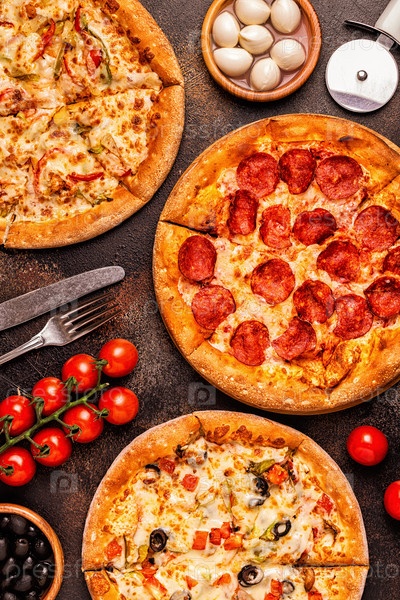 Набор различных пицц - пепперони, вегетарианская, курица с овощами