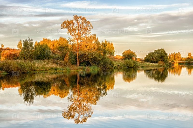 Осенний пейзаж с водой, разноцветными деревьями