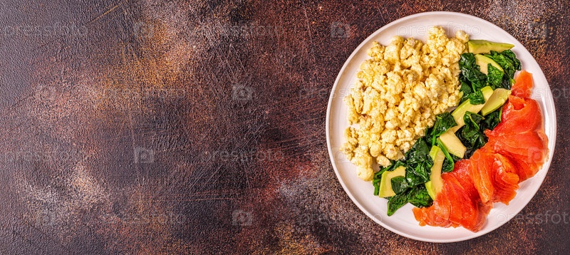 Кетогенный диетический завтрак, яичница, лосось, авокадо, шпинат