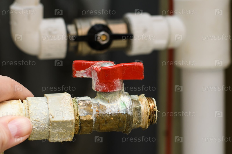 Старый водопроводный кран, покрытый известью и накипью, на фоне новой сантехники. Проблема некачественного водоснабжения в жилых домах