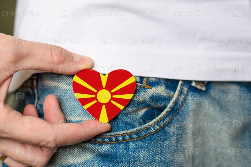 Патриот Македонии! Деревянный значок с македонским флагом в форме сердца в мужской руке
