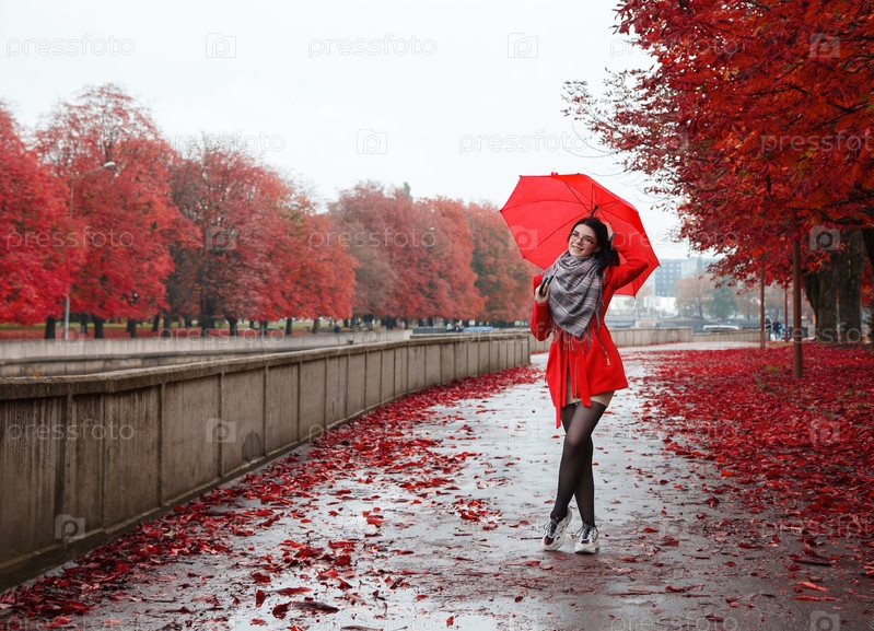 Маленькая девочка с зонтиком стоит на аллее парка после дождя