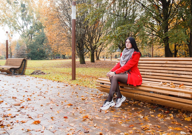 Молодая девушка в красном пальто сидит на скамейке в городском парке