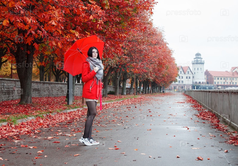 Молодая девушка в красном пальто с зонтиком стоит на аллее