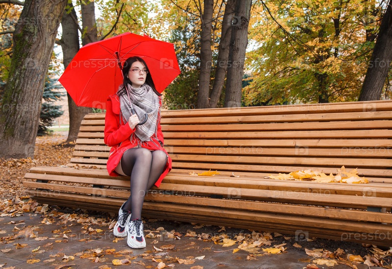 Молодая девушка в красном пальто с зонтиком сидит на скамейке в городском парке