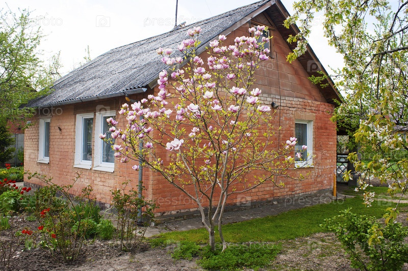 Цветущее дерево возле небольшого многоквартирного дома