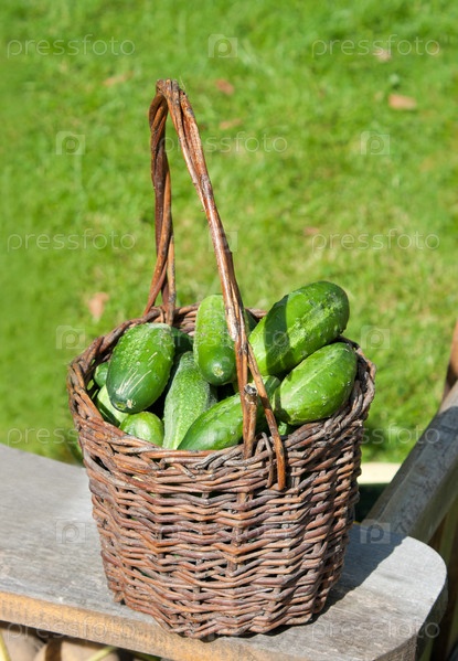 Корзина свежих огурцов на открытом воздухе на столе в праздник урожая