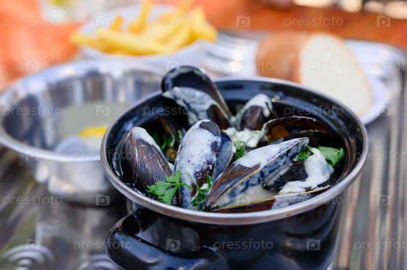 Запеканка с вареными черными мидиями в сливочном соусе. Обесы из морепродуктов. Акцент на мидии