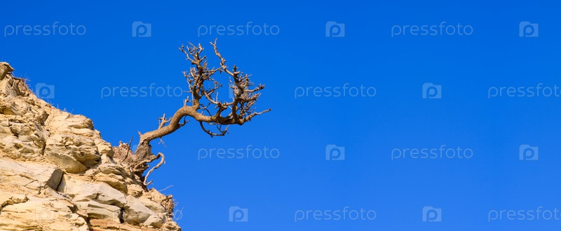 Старое сухое дерево на скале на фоне голубого неба. Пустое место справа для текста
