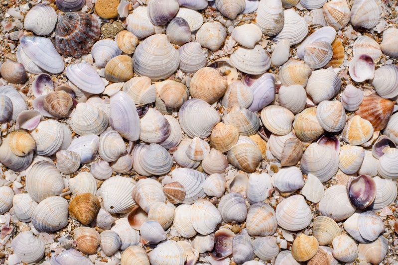 Много ракушек на пляже. Фон на морскую тематику