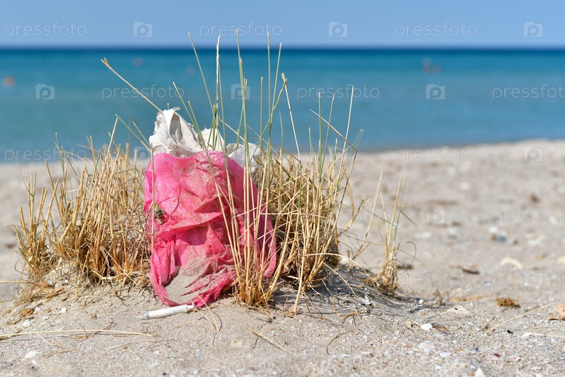 Мусор на пляже на фоне моря. Розовая сумка и шприц лежат на пляже