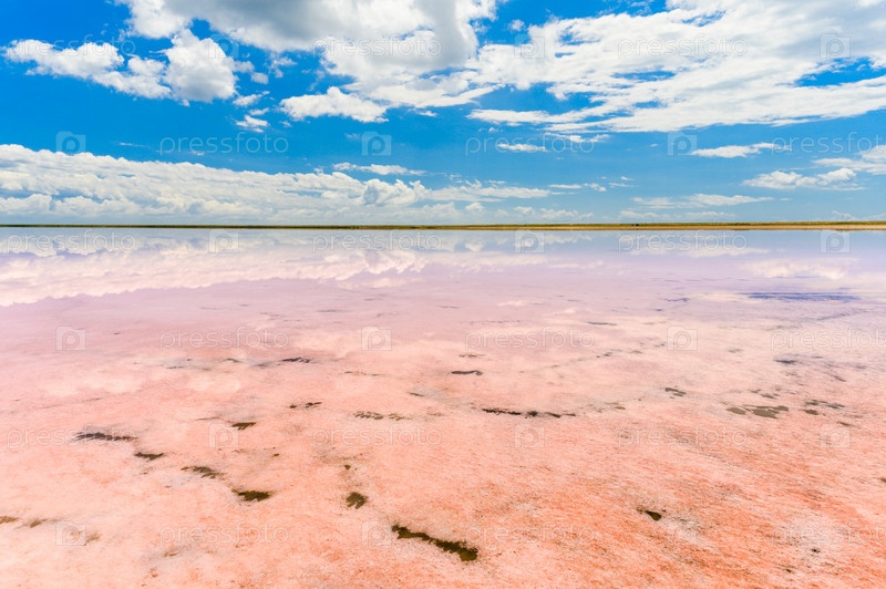 Поверхность розового озера под небом с облаками. Пейзаж на розовом озере днем