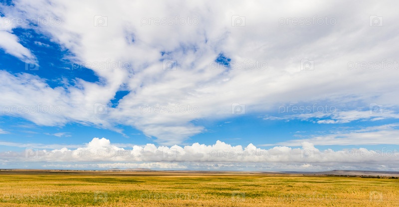 Желтое поле и огромные белые облака над ним. Сельский пейзаж