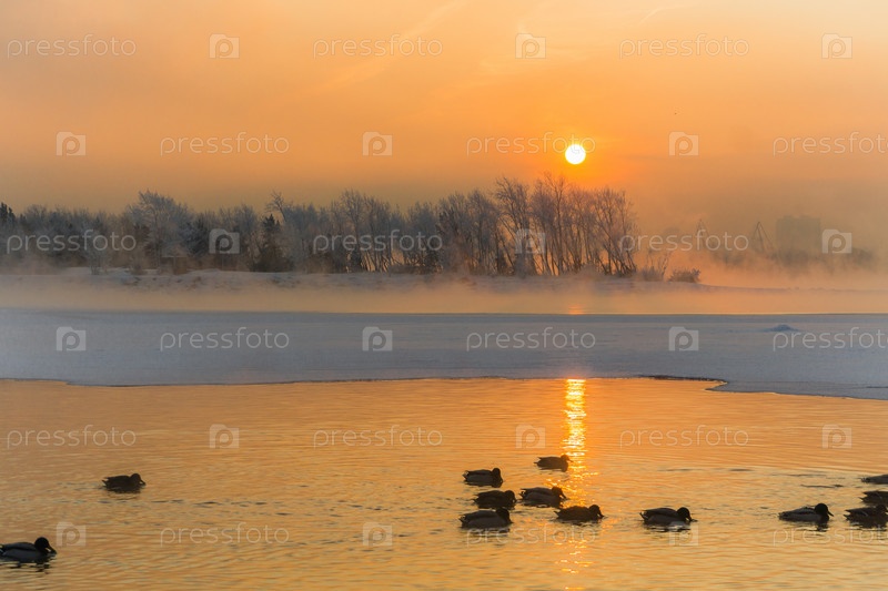 Морозное утро над Енисеем в центре Красноярска