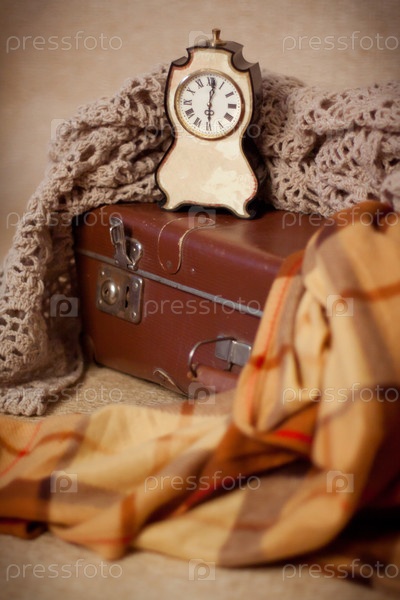 Часы на чемодане, накрытом вязаным пледом и пледом