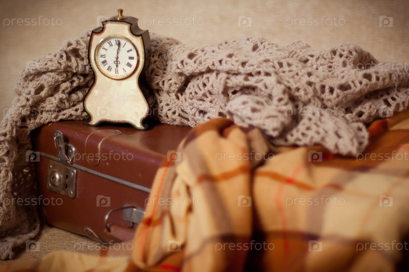 Часы на чемодане, накрытом вязаным пледом и пледом