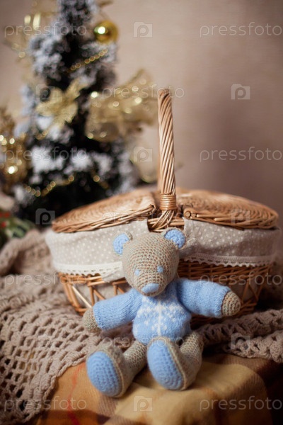 Вязаная игрушка мишка или мышка сидит возле плетеной корзины