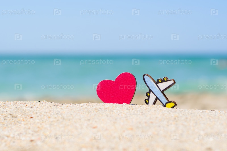 Красное сердце и маленький самолет стоят на песке на фоне моря. Концепция авиаперелетов