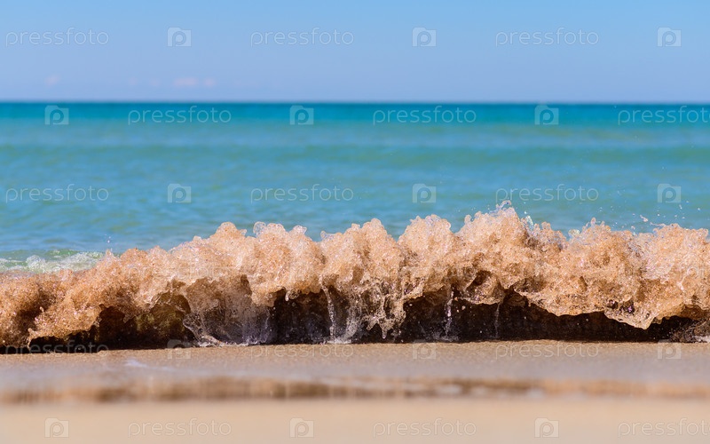Морская грязная волна с песком. Синее море и песчаный пляж