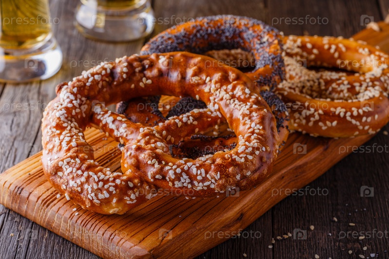 Крендели и пиво на деревянном фоне