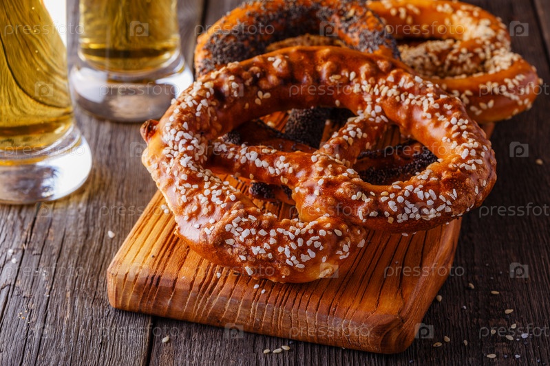 Крендели и пиво на деревянном фоне