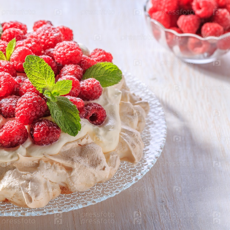 Безе Павлова со взбитыми сливками и свежей малиной