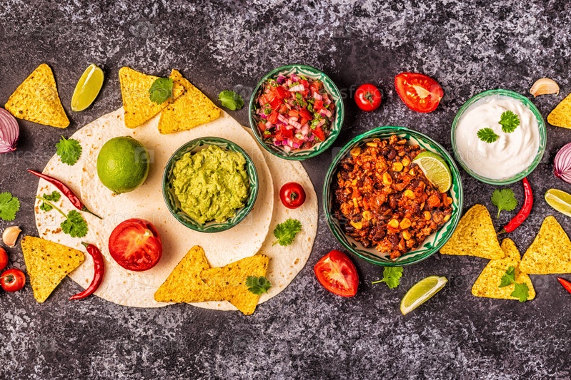 Концепция мексиканской кухни: лепешки, начос с гуакамоле, сальса