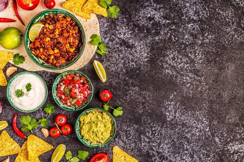 Концепция мексиканской кухни: лепешки, начос с гуакамоле, сальса