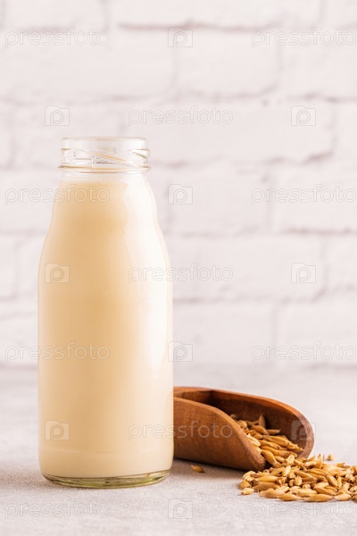 Бутылка овсяного молока и овса