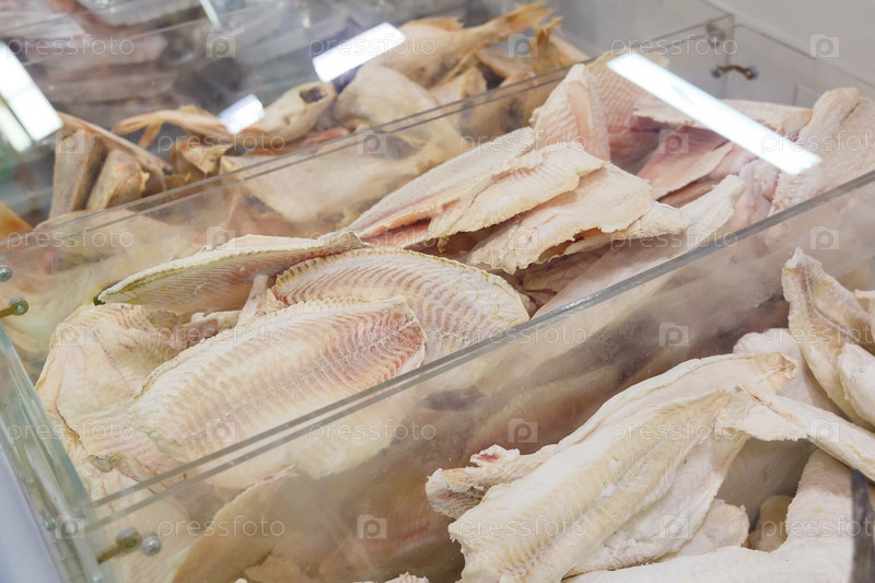 Рыба и морепродукты в холодильной витрине в продуктовом магазине