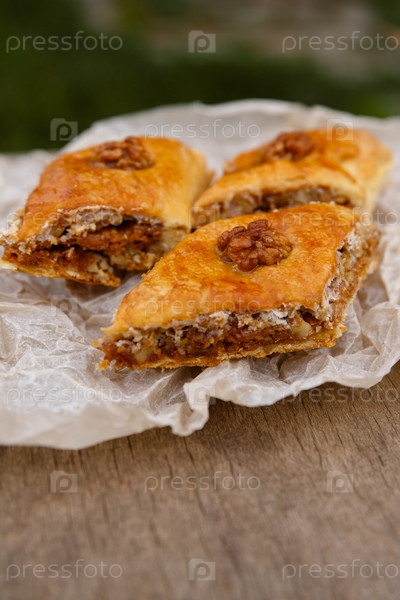 Восточные сладости - десертная пахлава, украшенная грецкими орехами