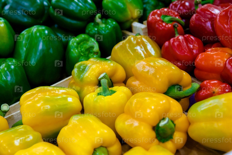 В магазине прилавок или витрина с болгарским перцем