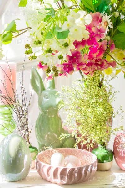 Пасхальное украшение интерьера. Красивая композиция со свечами. яйца, кролик, яблоки и цветущие цветы